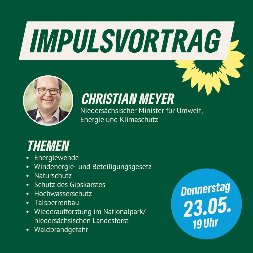 Übermorgen ist es soweit! Der niedersächsische Umweltminister Christian Meyer wird am Donnerstag, den 23. Mai um 19 Uhr im Foyer der Stadthalle Osterode einen Impulsvortrag halten und anschließend für Fragen zur Verfügung stehen. Die Grünen Osterode freuen sich über interessierte Bürgerinnen und Bürger.